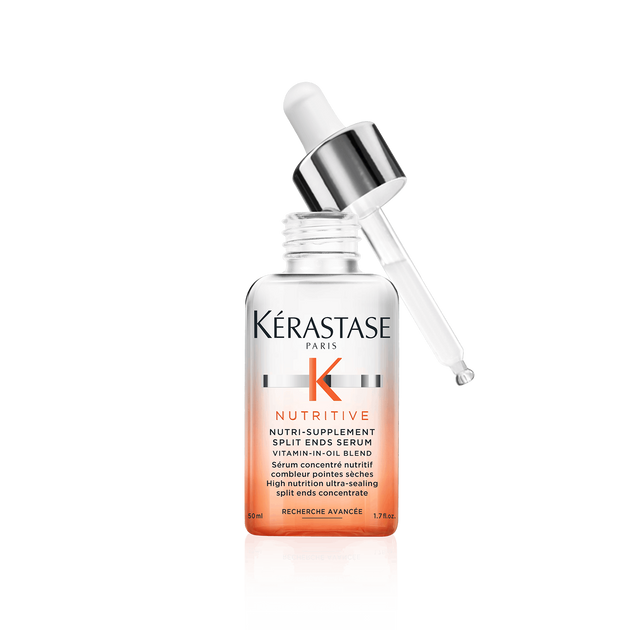 O Kérastase Nutri-Supplement Split Ends Serum é um sérum ultrasselante desenvolvido para nutrir profundamente e ajudar a prevenir o aparecimento de pontas duplas em cabelo seco. Formulado com polímeros antissecura e um óleo altamente nutritivo, contribui para selar as pontas, reforçar a fibra capilar e melhorar o conforto e suavidade do cabelo. A textura oleosa translúcida envolve as pontas sem pesar, devolvendo flexibilidade e um aspeto cuidado.