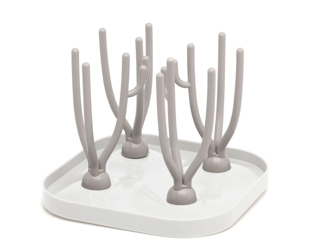 É um pequeno estojo, perfeito para armazenar e transportar em pouco espaço, abre-se como um livro e do seu interior sai uma estrutura com distintas alturas sobre as quais podemos deixar a secar e a escorrer qualquer biberão, tetina ou outro acessório do bebé.