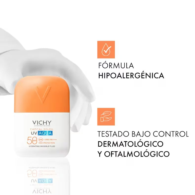 Descobre o Vichy Capital Soleil UV Aqua Fluido Invisível SPF50, um fluido solar hidratante de uso diário com uma sensação refrescante como a água. Desenvolvido com tecnologia UV Aqua, oferece uma experiência leve, invisível e confortável na pele.