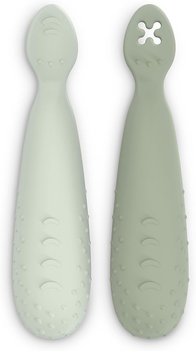 Conjunto de duas colheres em silicone, ideais para a introdução alimentar e método BLW (Baby-Led Weaning). Com cabo antiderrapante, ponta plana e texturizada, estas colheres foram desenhadas para facilitar a alimentação autónoma do bebé, promovendo o desenvolvimento motor.