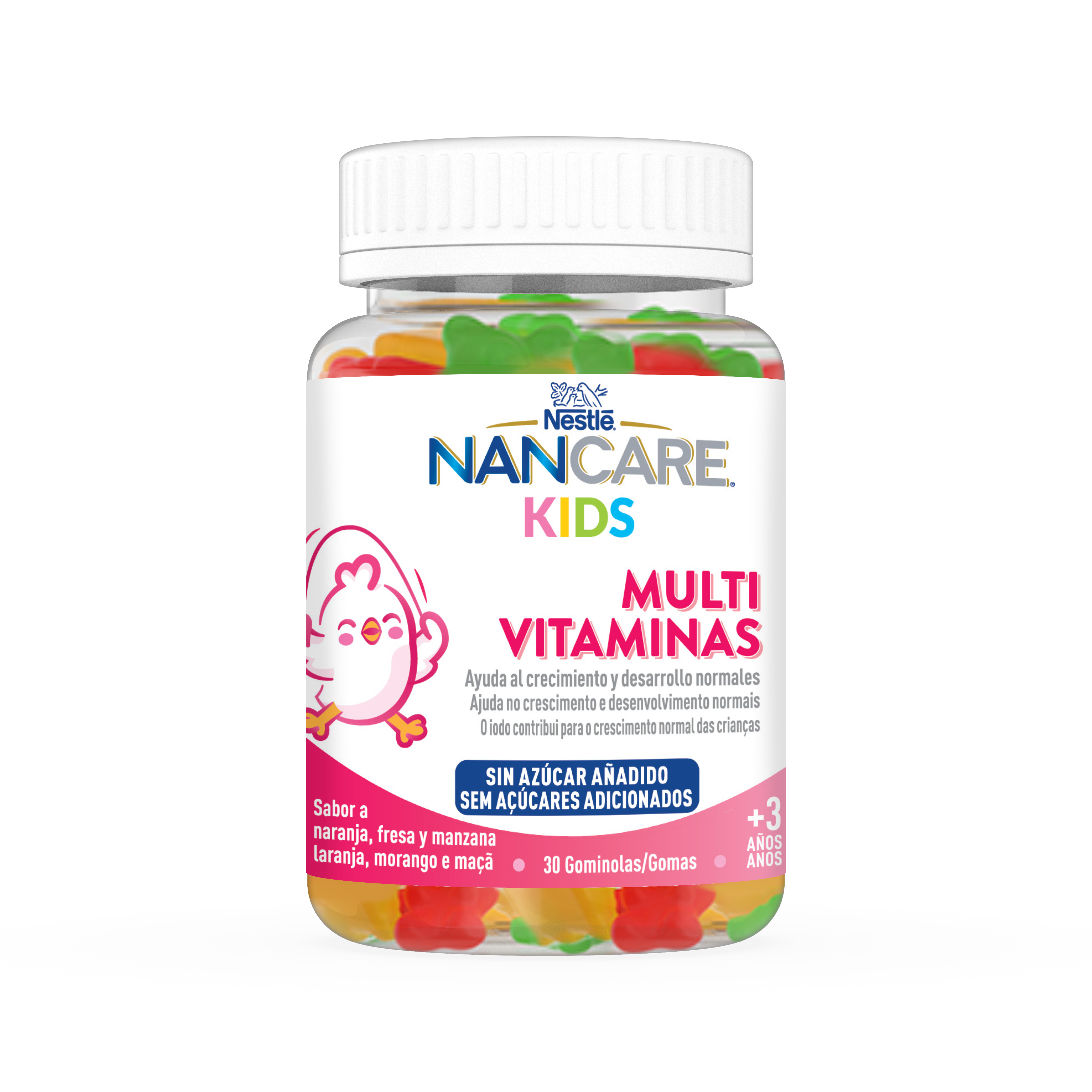 NANCARE Kids Multivitaminas são gomas pediátricas sem adição de açúcar, desenvolvidas para apoiar o crescimento e o desenvolvimento normal das crianças a partir dos 3 anos.